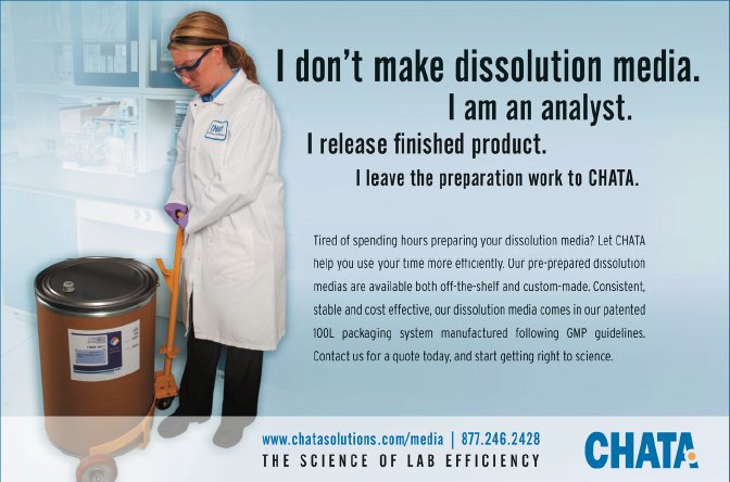 Fort Collins, CO, July 19, 2005 – Chata Biosystems introduces offers pre–mixed 0.1N HCl for dissolution testing. The reagent, commonly used in pharmaceutical applications, comes conveniently packaged in Chata's disposable, impermeable 100L CHEM+NECT™ flexible bag technology. The bag is placed inside a 30 gallon fiber barrel, which m. The barrel may be easily connected directly to an automated dissolution system, or can be dispensed into a carboy with an available pump accessory from Chata. The pre–packaged solution reduces preparation time, increases consistency and eliminates handling caustic hydrochloric acid.