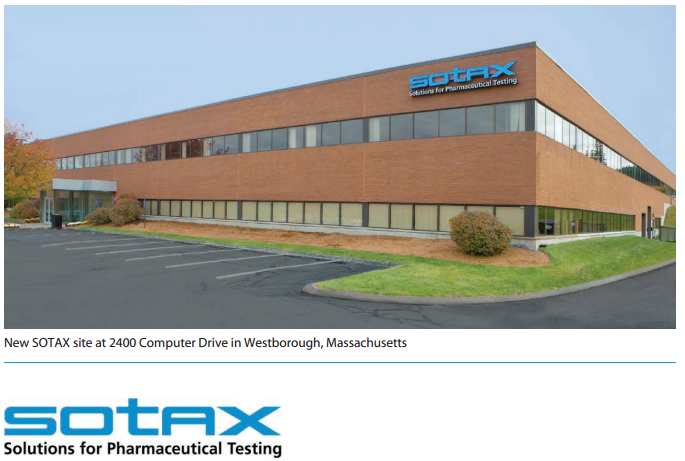 Westborough,MA—November 2012—SOTAX Corporation continues its expansion in North America with the establishment of a new facility in Westborough, MA. The site includes a large application and demonstration laboratory, conference rooms to host seminars and workshops, as well as instrument assembly, quality control, and product development areas.